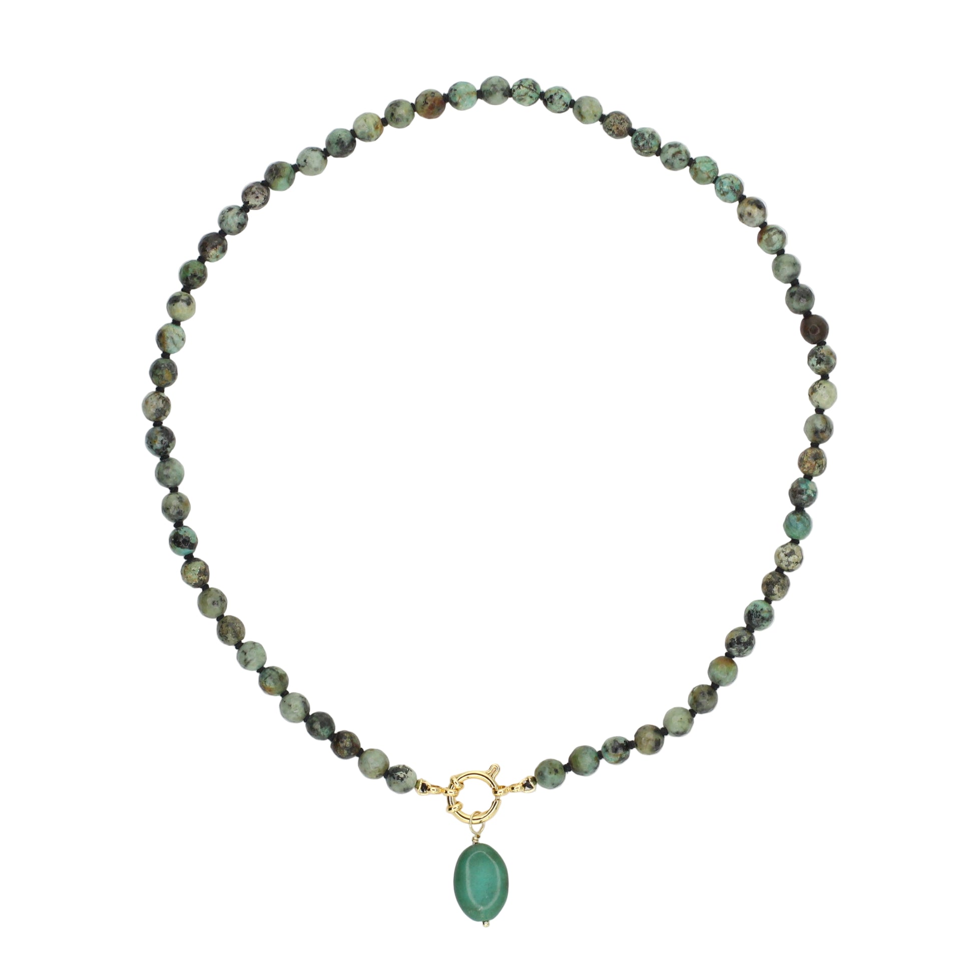 Elevate your style with this stunning African Turquoise necklace, available in 18.25" length. Hand-knotted with luxurious black silk thread and featuring an oval Turquoise pendant on a unique 24K gold-filled clasp. The pendant can easily be removed from the clasp. The necklace can be worn without a pendant, or add a different pendant for versatility. African Turquoise is thought to promote evolution, balance, and wisdom.