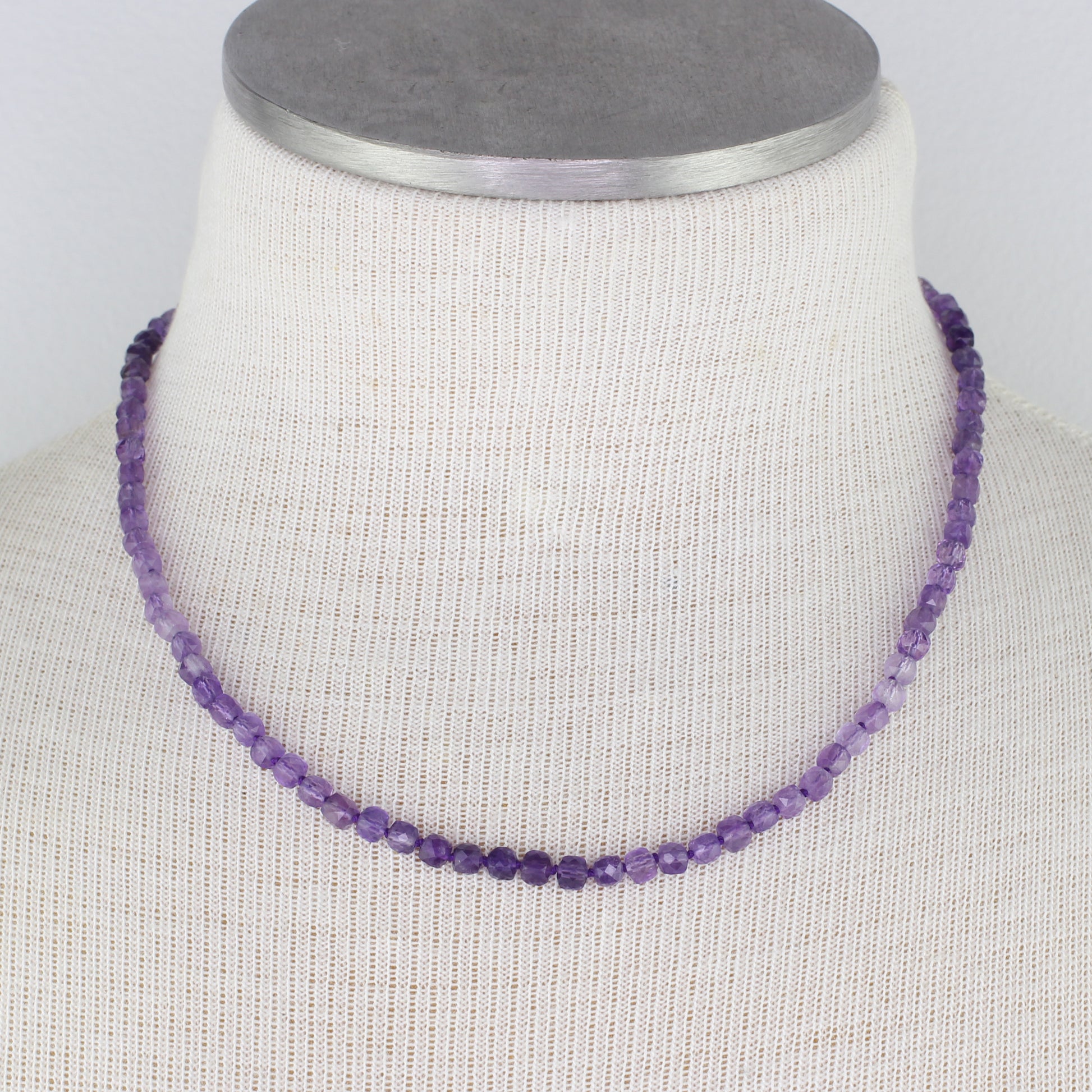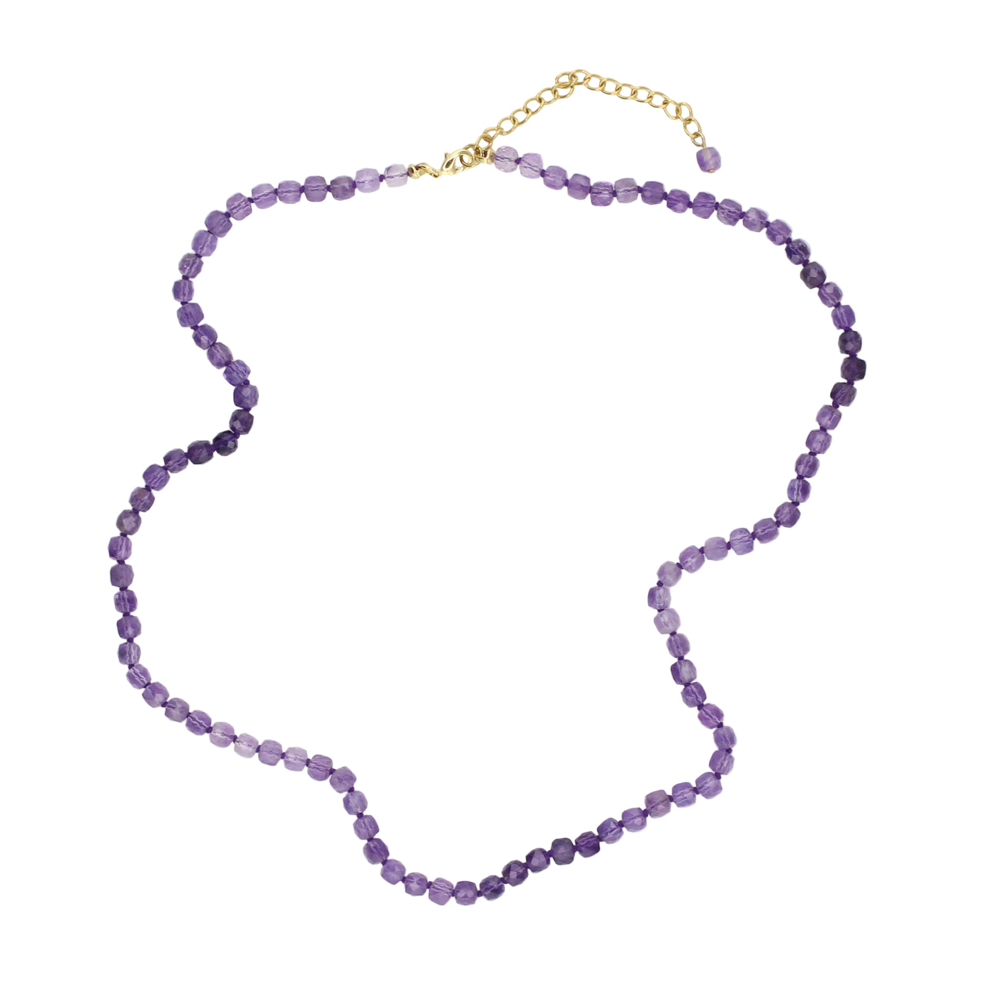 This elegant 18-inch necklace features Amethyst gemstones arranged in a subtle ombre effect and hand-knotted on purple silk thread. The necklace is secured with a 24K gold-filled clasp paired with a 2-inch extender for versatility of length. Amethyst is believed to have calming properties, helping to ease anxiety and foster a sense of peace and harmony.