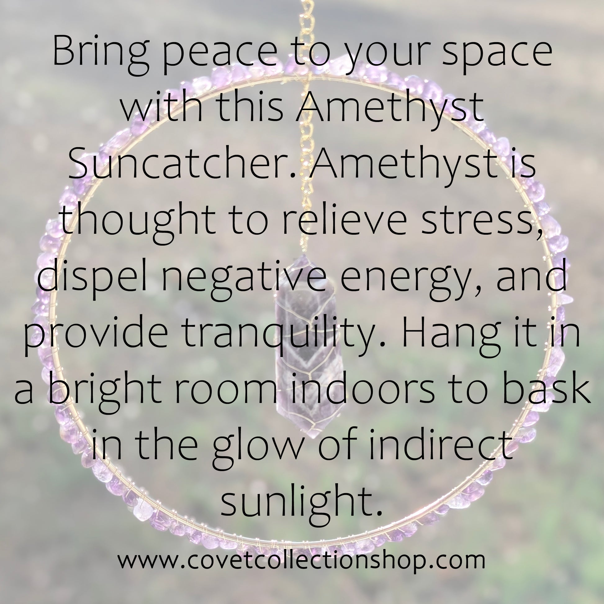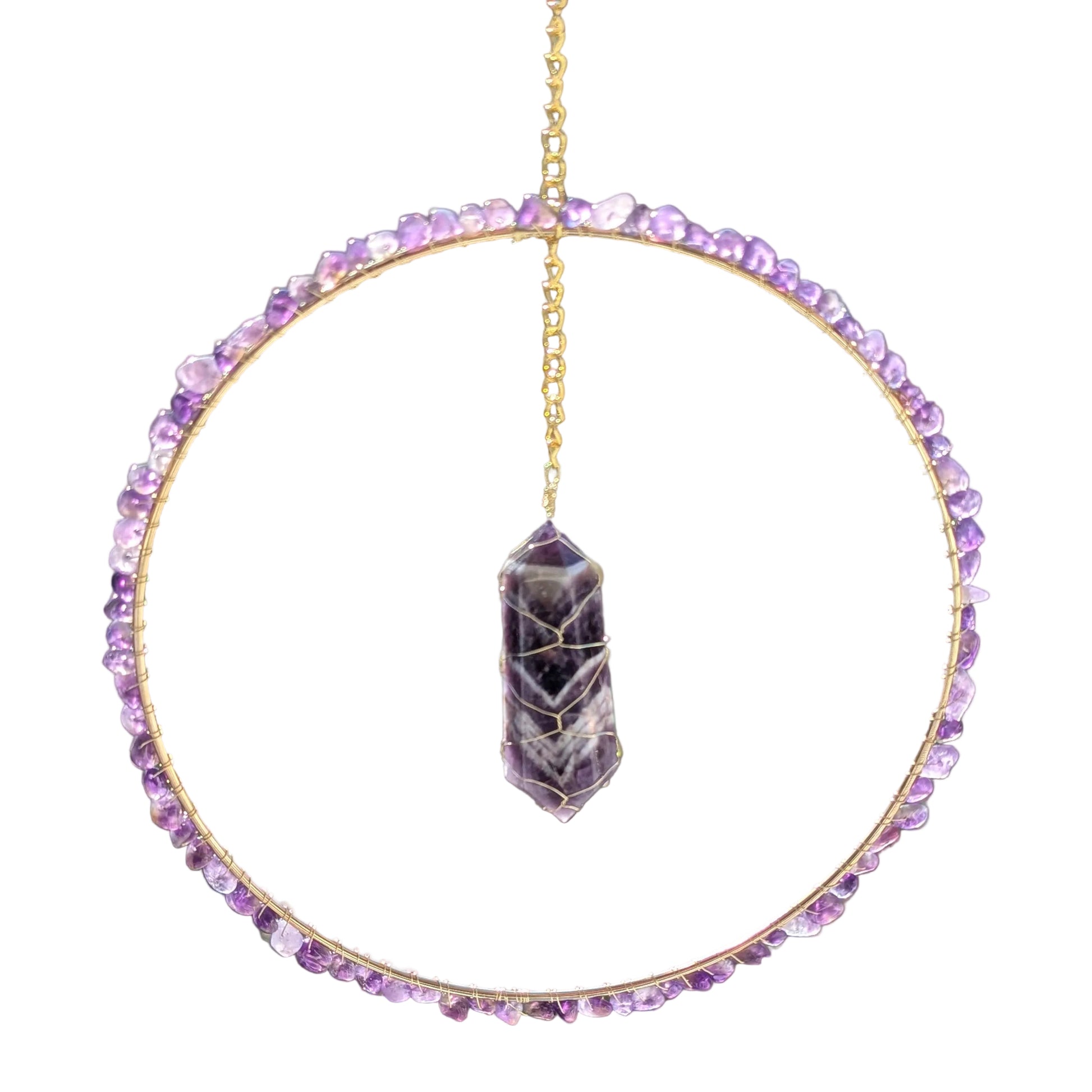 Bring a touch of elegance to your space with this brilliant Suncatcher, adorned with delicate Amethyst chip gemstones and a banded Amethyst stone dangling in the center. The 8" gold hoop is paired with an 18" gold chain, allowing it to catch the light beautifully. This is a one-of-a-kind item. The Suncatcher pictured is the one you will receive.