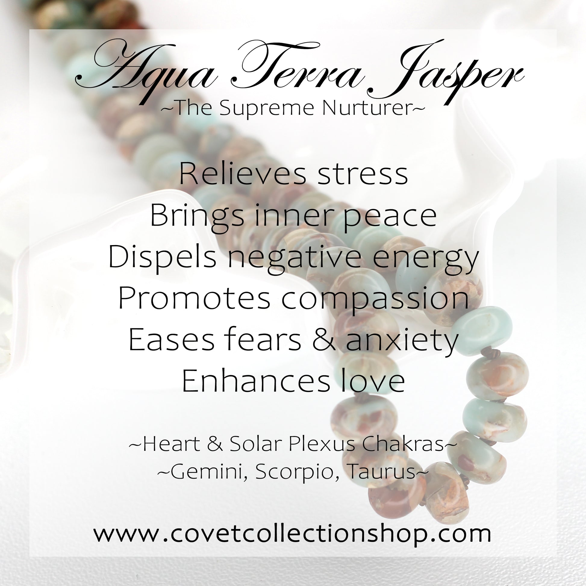Discover serenity with the Aqua Terra Jasper 18.5" necklace.. Hand-knotted with ivory silk thread and featuring a 24K gold-filled clasp with a two-inch extender for versatility. Aqua Terra Jasper is known for promoting inner peace and clarity of thought.