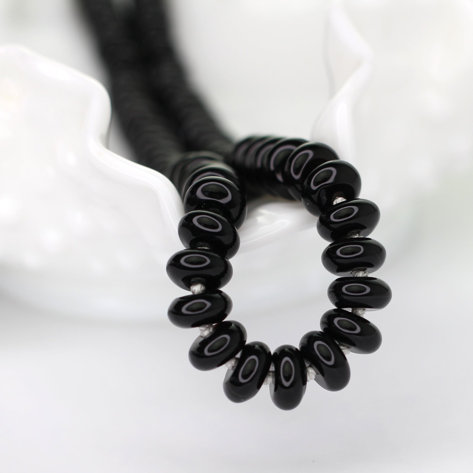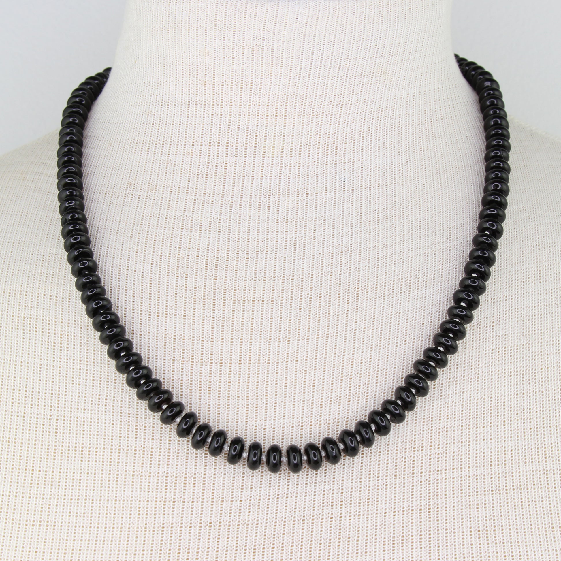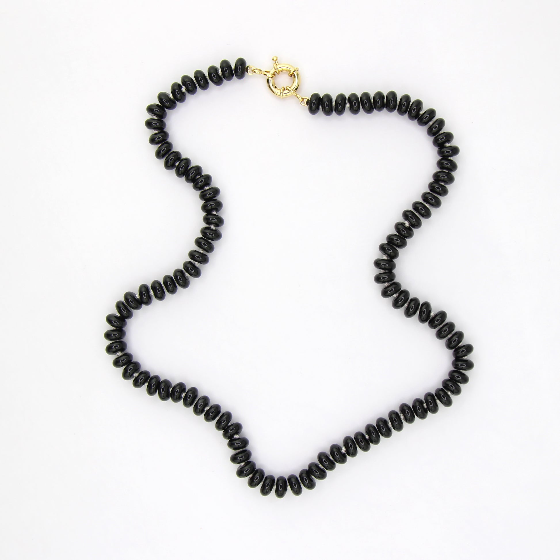 Make a bold statement with the Black Agate 20.25" bead necklace, expertly hand-knotted with white silk thread and featuring a gold-filled clasp.