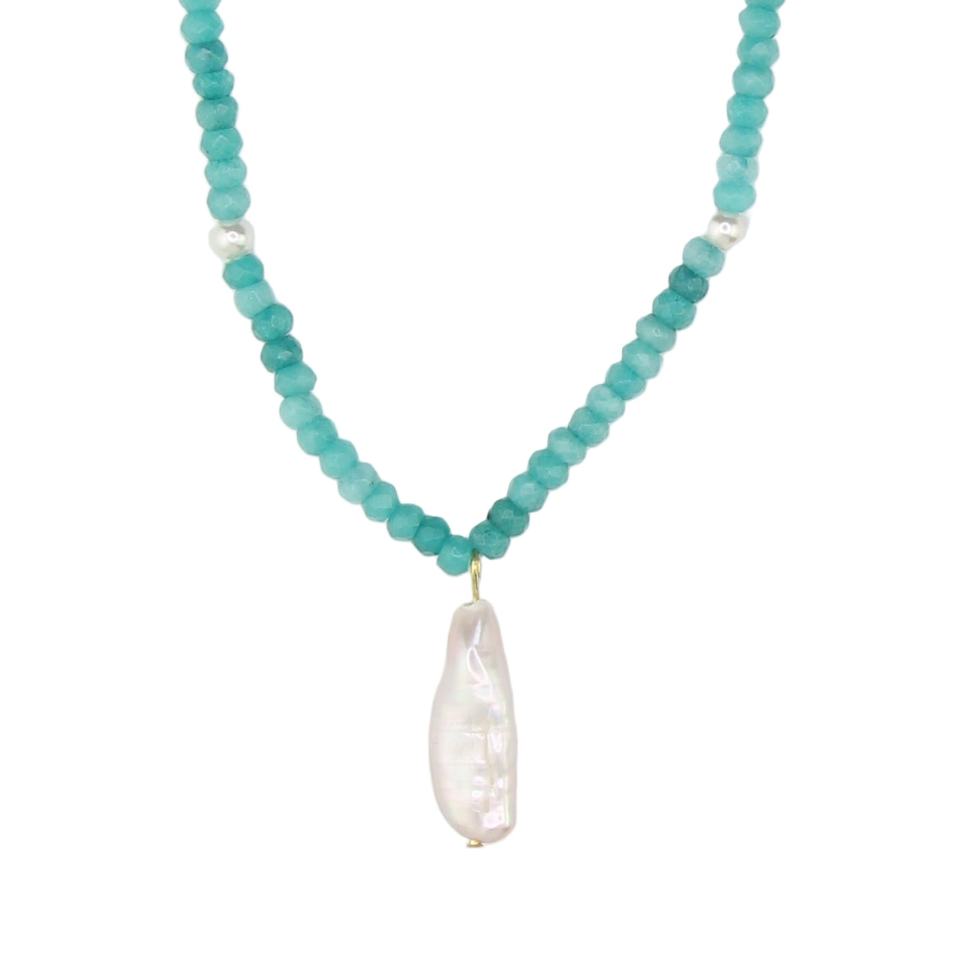 Enhance your collection with the Blue Jade and Freshwater Pearl pendant necklace. Faceted Blue Jade gemstones are complemented with four round Freshwater Pearls and one Biwa Pearl pendant, dropping 2.6cm. The necklace measures 16.25" with a gold-filled clasp and a 2" extender. This versatile piece is perfect for layering and highlights the calming beauty of Blue Jade, believed to promote peace and bring luck, paired with Pearls, thought to stabilize moods and bring clarity.