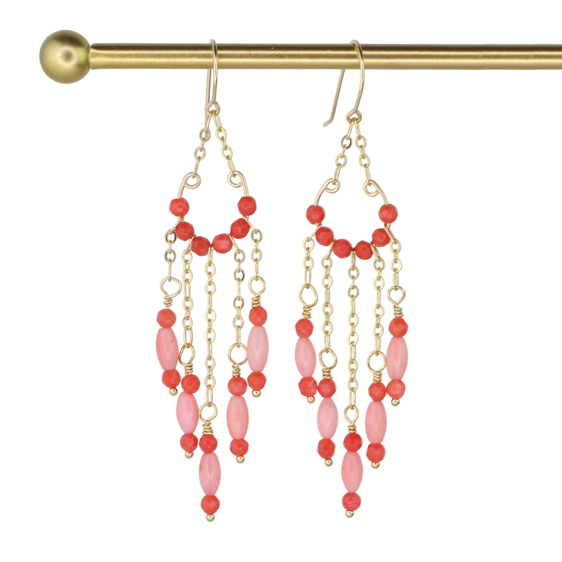 These exquisite chandelier earrings showcase natural Coral in two shades of pink. 24K gold-filled chain is used to create the chandelier effect as they hang 3.5" from 24K gold-filled earwires. Coral is believed to expand creativity and boost confidence.