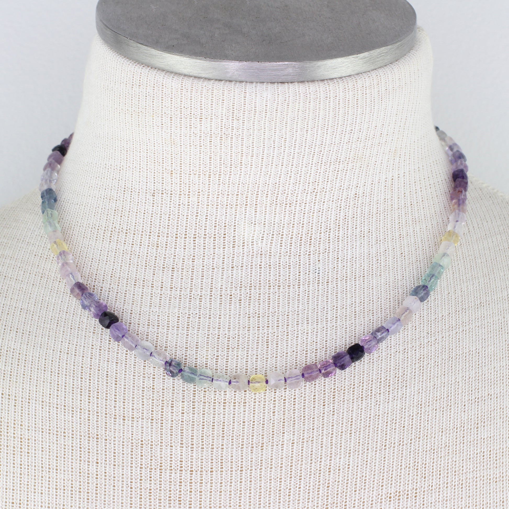 Elevate your style with this stunning 17.5" Fluorite necklace. It's hand-knotted with luxurious, purple silk thread, and finished with a 24K gold-filled clasp and 2" extender for versatility. Fluorite is thought to enhance intuition and bring emotional balance.