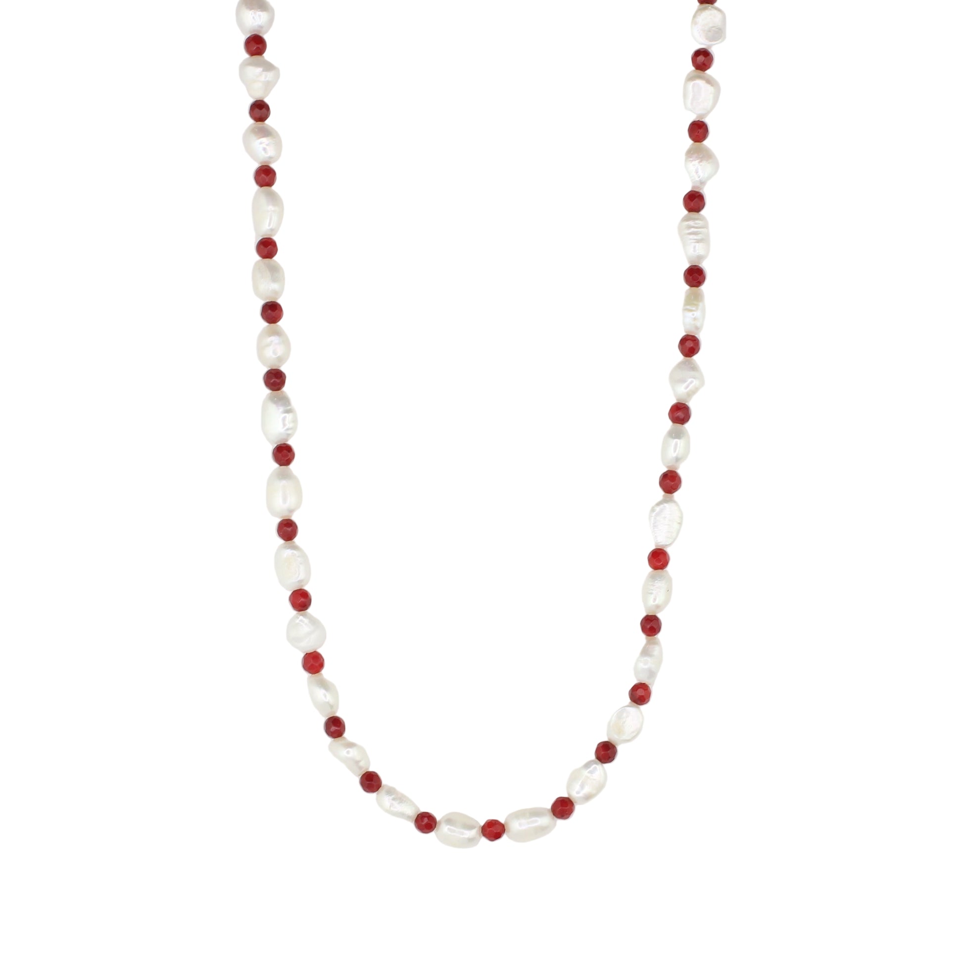 This lovely 19" necklace features white Freshwater Pearls with red Coral beads strung on silk thread. The necklace is finished off with a 24K gold-filled clasp and a 2-inch extender for versatility. Perfect for stacking with other necklaces or worn alone for a subtle yet eye-catching look. Pearls are thought to release negative emotions and promote mental clarity, while Coral is believed to enhance courage and boost confidence.