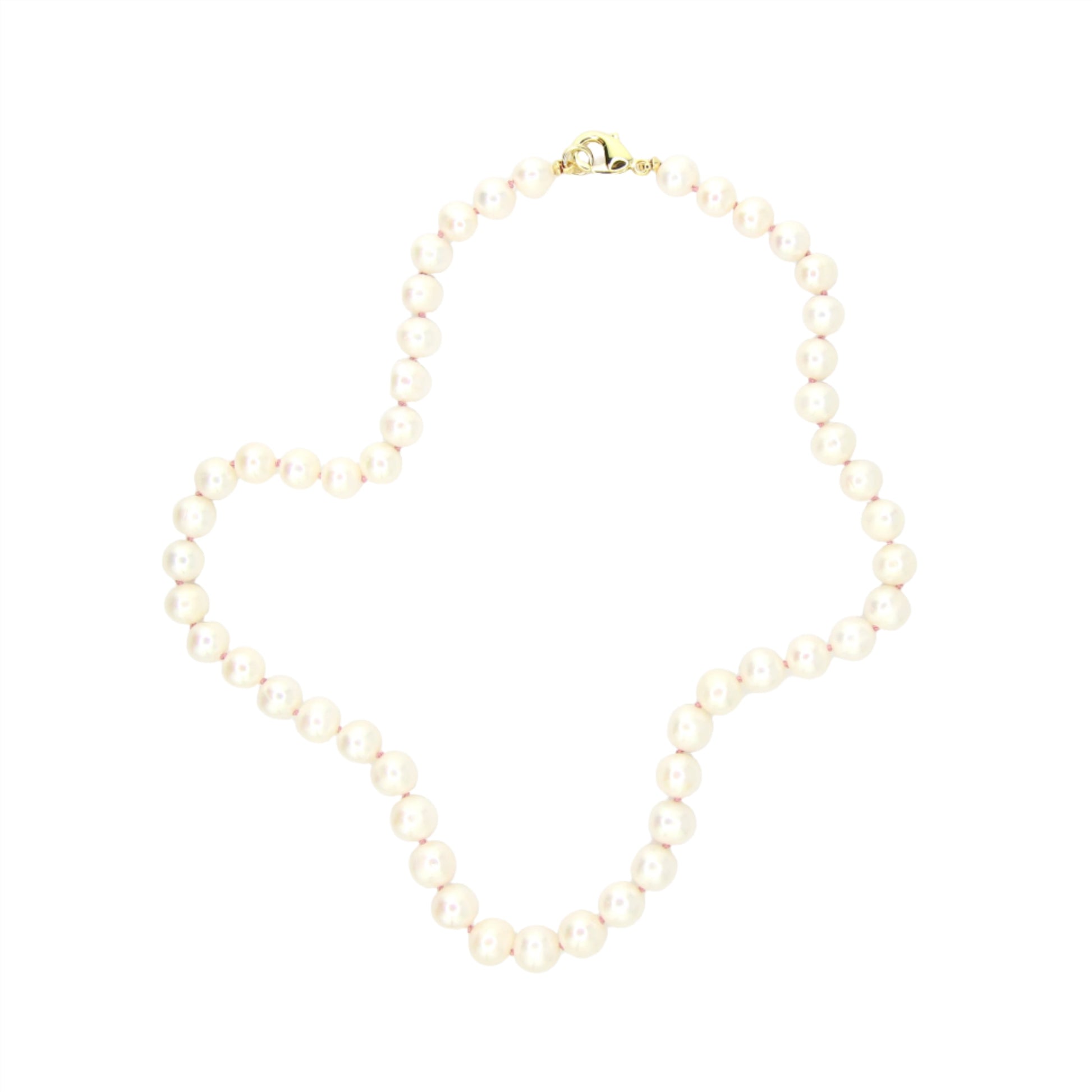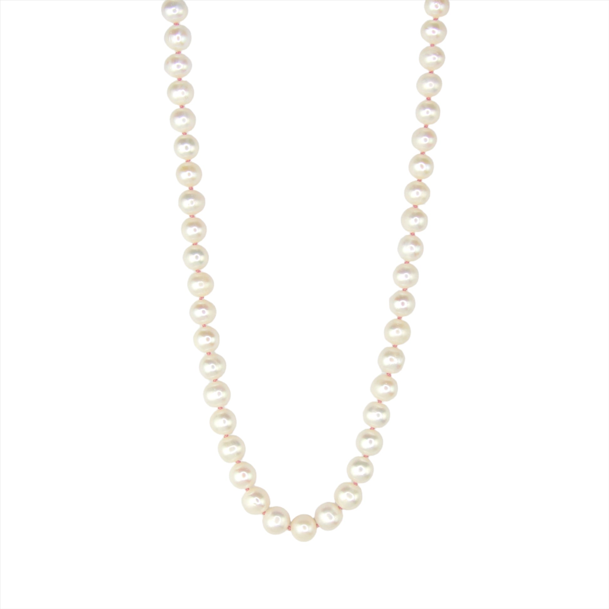 This stunning 17.5" AA grade Freshwater Pearl necklace is hand-knotted with luxurious pink silk thread, showcasing a timeless elegance. The gold-filled clasp ensures secure wear while allowing for the easy addition and removal of charms, making it a versatile piece for any occasion.