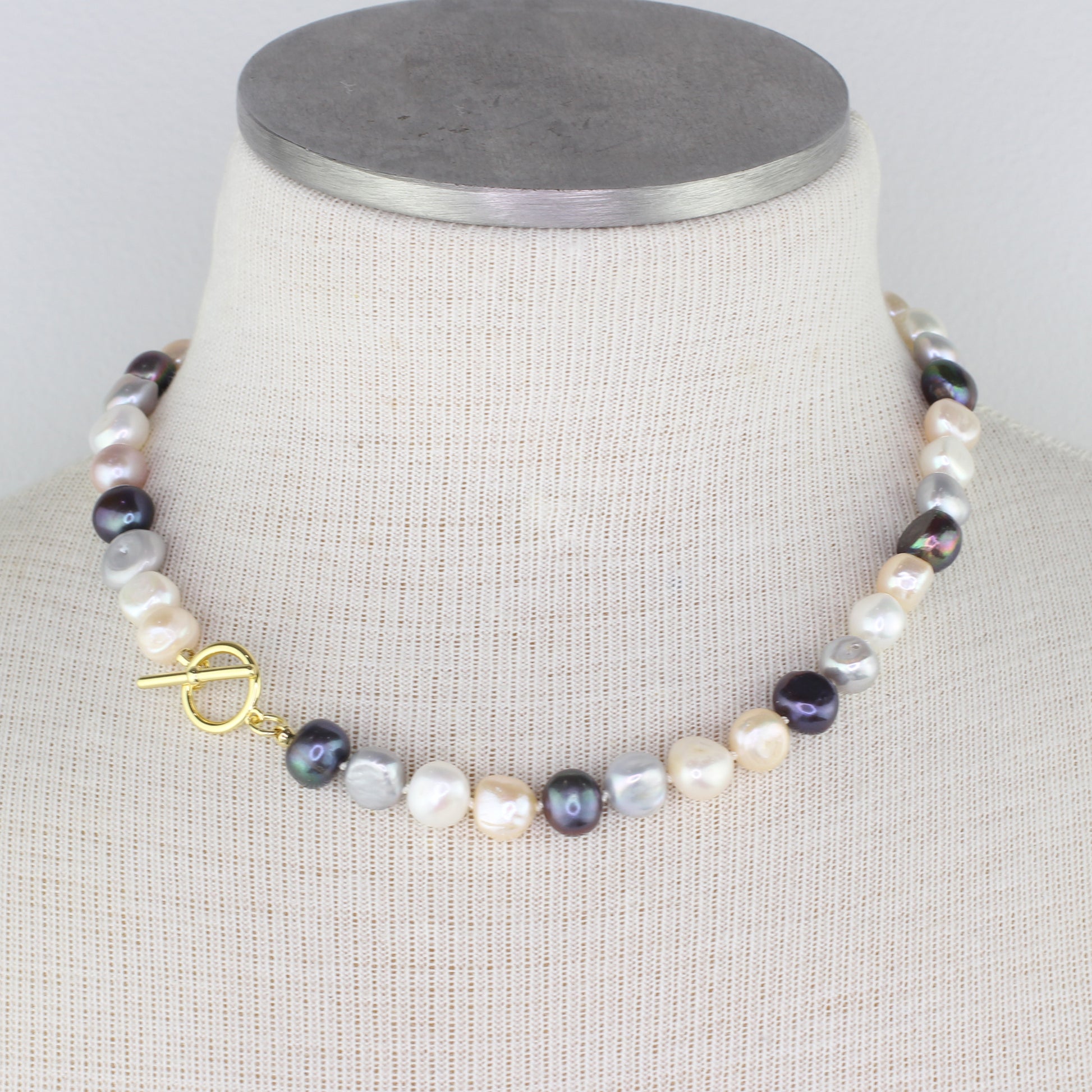 This stunning 18.5" necklace showcases a combination of white, black, gray, and peach Freshwater Pearls. The necklace is hand-knotted with luxurious ivory silk thread and finished off with a 24K gold-filled toggle clasp. Freshwater Pearls are believed to calm emotions, improve memory, and enhance intelligence, adding meaningful allure to this beautiful accessory.