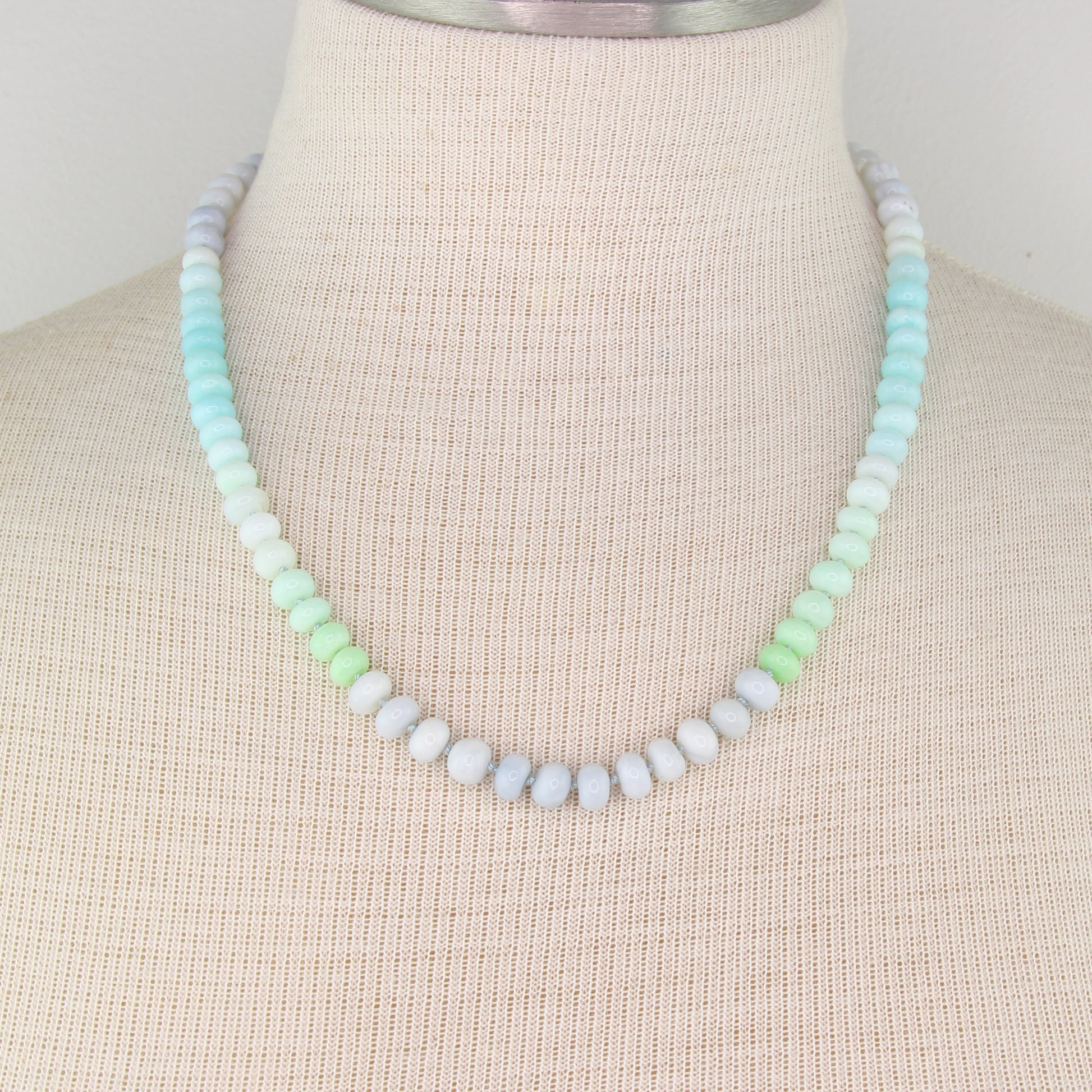 This beautiful "Caribbean Blue" Opal necklace measures 19" and features a stunning mix of green and blue Opals, hand-knotted with light blue silk thread for a delicate touch. Finished with a secure gold-filled clasp, this piece beautifully combines style and meaning. Blue Opals are believed to reduce tension and increase confidence, while green Opals are thought to heal and harmonize emotions.