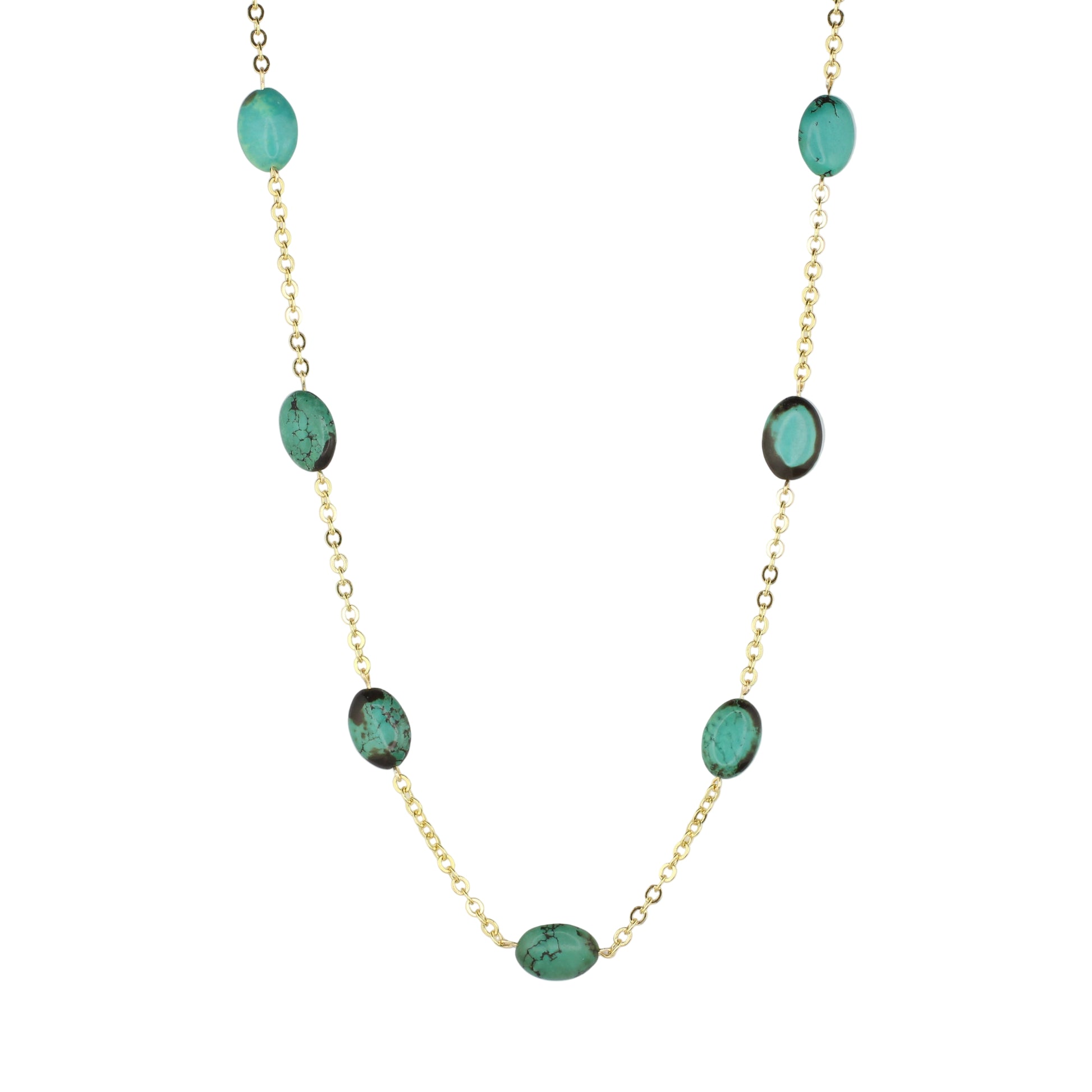 Discover the beauty of the Turquoise 32.5" statement necklace. A 24K gold-filled chain is paired with the gorgeous tones of oval-shaped Turquoise gemstones. Turquoise is thought to promote vitality and stabilize mood swings.